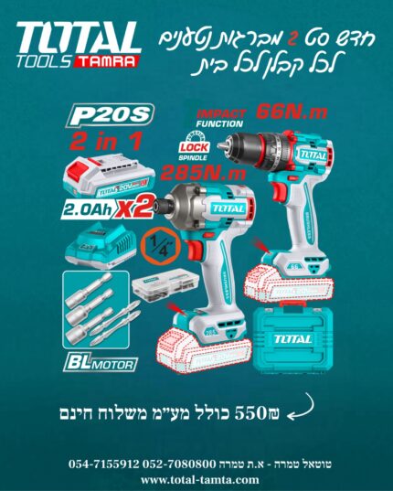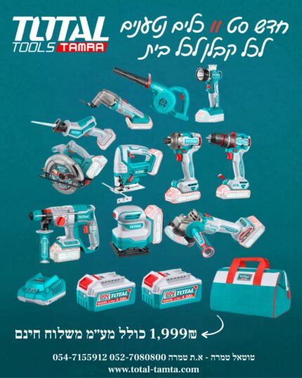 סט 5 כלים נטענים TOTAL - סט מקצועי המיועד למגוון רחב של עבודות. כולל כלים איכותיים ואמינים, המספקים פתרונות יעילים לבית ולעסק.